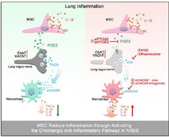 研究人員構建小鼠ARDS模型,發現靜脈輸注MSC明顯緩解了肺損傷癥狀,同時,膽堿能系統相關基因ChAT、VAChT在肺組織中表達量顯著增加,提示CAP可能在MSC治療ARDS的過程中發揮重要作用。課題組隨后證實MSC主要通過合成、分泌前列腺素E2促進ChAT表達和乙酰膽堿產生。
