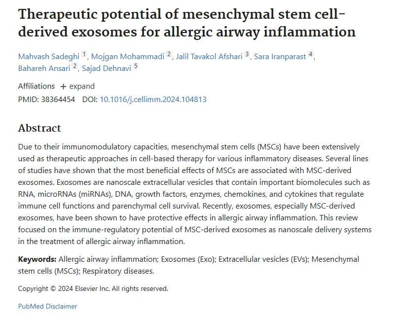該研究探討了間充質干細胞外泌體(MSC-Exosomes)在過敏性氣道炎癥(如哮喘和鼻炎)中的作用機制,指出MSC-Exo通過攜帶miRNA(如miR-146a)和細胞因子(如TGF-β1)等物質,抑制NF-κB信號通路,減少Th2型促炎因子(如IL-4)的釋放,同時促進調節性T細胞增殖,糾正Th1/Th2免疫失衡,從而緩解鼻腔炎癥。