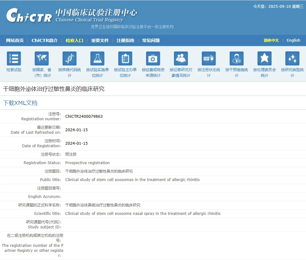 2024年,常州市第三人民醫院開展了一項研究,旨在評估干細胞外泌體噴鼻治療對常規抗過敏藥物無效或療效不佳的過敏性鼻炎患者的有效性與安全性。據報道,團隊已完成10例患者的預試驗。結果顯示,間充質干細胞外泌體具有良好的生物相容性。