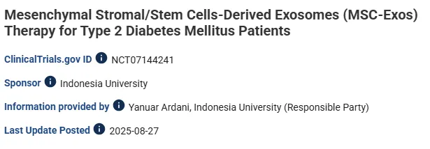 02、印度尼西亞大學(xué)2025年8月27日更新的一項(xiàng)臨床研究顯示,利用間充質(zhì)干細(xì)胞外泌體治療2型糖尿病取得了積極效果。