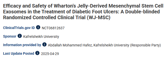 03、埃及Kafrelsheikh大學(xué)的一項(xiàng)臨床研究,探索了用臍帶來(lái)源的間充質(zhì)干細(xì)胞外泌體(WJ-MSC-Exo)治療糖尿病足潰瘍的效果。