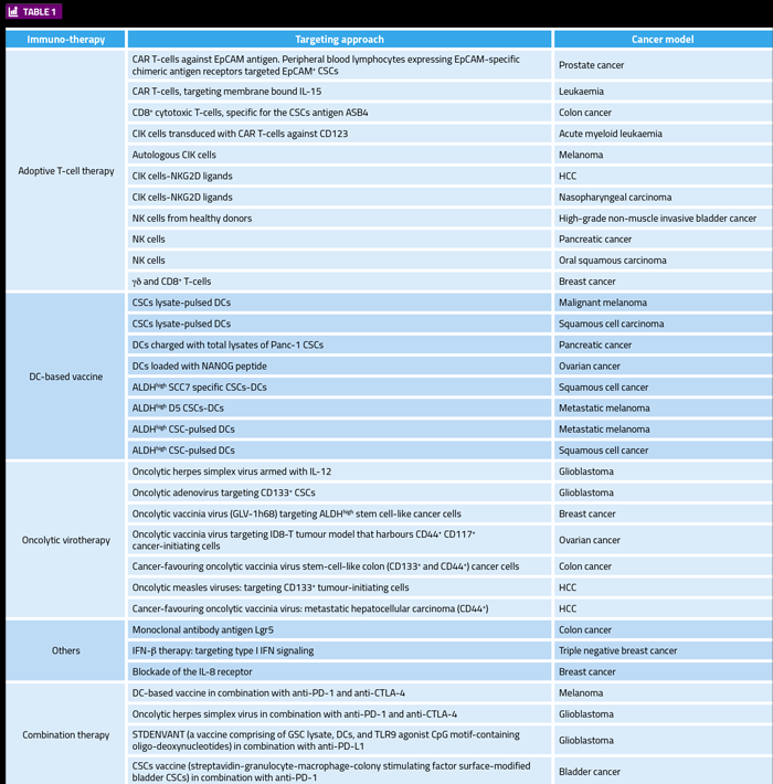 CSCs 的免疫治療靶點包括免疫細胞,如細胞因子誘導的殺傷性 (CIK) 細胞、自然殺傷 (NK) 細胞、T 細胞和 CD8+ T 細胞。基于DC的疫苗也針對CSCs;溶瘤病毒療法(OVT)通過免疫原性細胞死亡和T細胞活化誘導抗腫瘤免疫。免疫療法的組合也用于靶向CSCs。最近,聯合治療的策略包括基于DC的疫苗,溶瘤病毒和免疫檢查點阻滯。