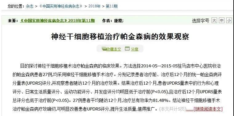 2018年,中國實用神經疾病雜志刊登了“神經干細胞移植干預帕金森的效果觀察”一文。